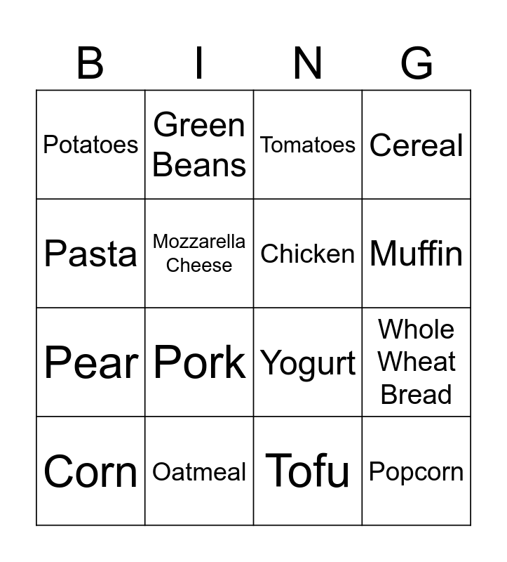 This bingo card has 34 words: Milk, Beans, Peas, Radishes, Popcorn, Chicken, Pasta, Cheddar Cheese, Green Beans, Sunflower Seeds, Muffin, Tomatoes, Soy Milk, Lettuce, Oatmeal, Pork, Peppers, Yogurt, Nuts, Tortilla, Rice, Watermelon, Potatoes, Tofu, Cottage Cheese, Corn, Cereal, Fish and Shellfish, Pear, Mozzarella Cheese, Orange, Whole Wheat Bread, Spinach and Eggs.