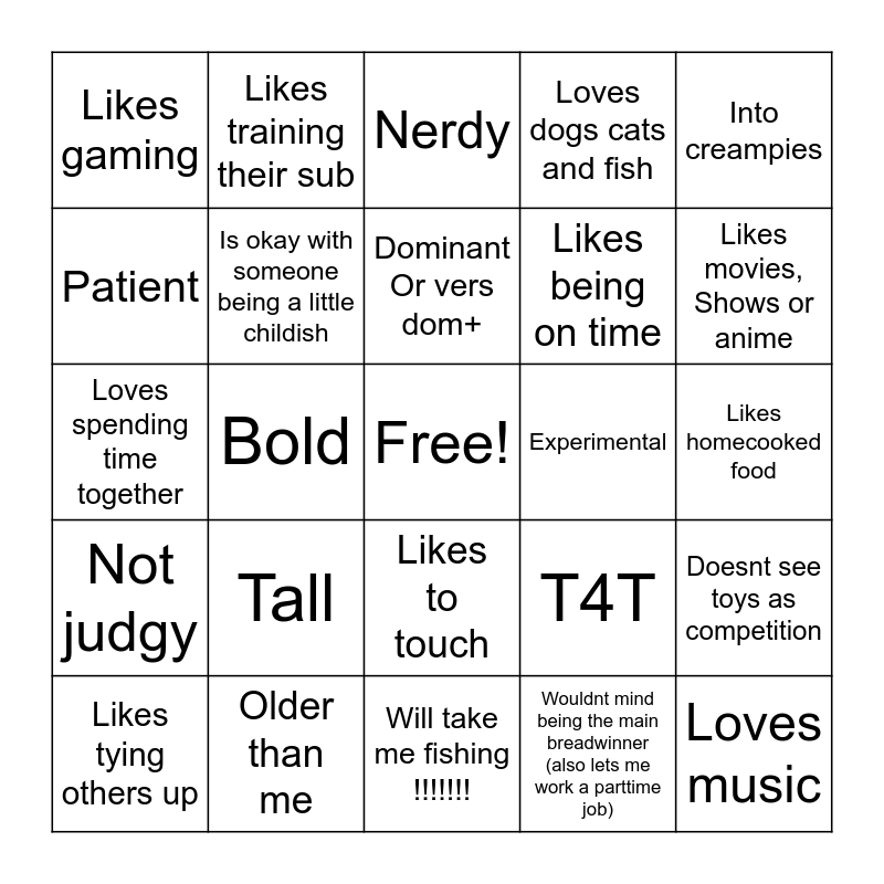 This bingo card has a free space and 24 words: Tall, Older than me, Dominant Or vers dom+, Likes tying others up, Into creampies, Likes gaming, Patient, Likes training their sub, Experimental, Likes to touch, Likes being on time, Loves spending time together, T4T, Doesnt see toys as competition, Is okay with someone being a little childish, Wouldnt mind being the main breadwinner (also lets me work a parttime job), Likes homecooked food, Nerdy, Likes movies, Shows or anime, Bold, Loves music, Not judgy, Loves dogs cats and fish and Will take me fishing !!!!!!!.
