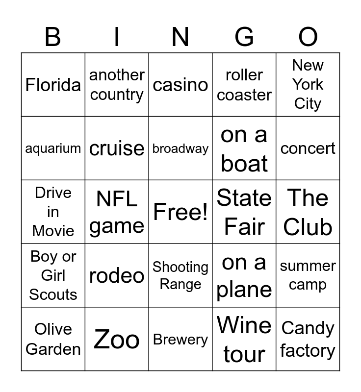 This bingo card has a free space and 29 words: Olive Garden, hibachi, NFL game, Major League Baseball Game, Florida, casino, cruise, rodeo, State Fair, Zoo, The Club, Candy factory, Brewery, Wine tour, concert, circus, Shooting Range, Boy or Girl Scouts, New York City, Drive in Movie, on a plane, on a train, on a boat, aquarium, roller coaster, another country, summer camp, broadway and rock climbing.