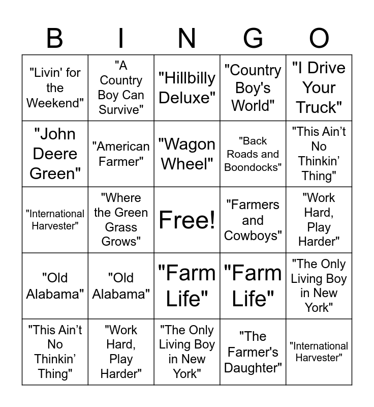 ⚠ This card has duplicate items: "Take Me Home, Country Roads" (2), "International Harvester" (2), "Farm Boy" (2), "This Ain’t No Thinkin’ Thing" (2), "A Country Boy Can Survive" (2), "The Farmer's Daughter" (2), "Hillbilly Deluxe" (2), "Livin' for the Weekend" (2), "I Drive Your Truck" (2), "Work Hard, Play Harder" (2), "Country Boy's World" (2), "Farmers and Cowboys" (2), "Farm Life" (2), "Old Alabama" (2), "Good Time" "Back to the Farm" (2), "The Only Living Boy in New York" (2)