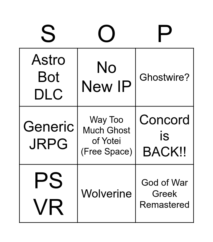 This bingo card has a free space and 24 words: Infamous Remaster, Kingdom Hearts IV, Wolverine, Last of Us 2 PS5 Pro Remastered, God of War Greek Remastered, Astro Bot DLC, Concord is BACK!!, No New IP, Streamer Game/ Announcer, bad camera quality of WFH person, WEEB Game, For Kids, GOW New Trailer, Fishing game/DLC, PS VR, Farcry For Girls, Deathloop Yawn, Ghostwire?, GT, Yoko Taro I Love You, Returnal, SMT, Generic JRPG and Ratchet and Clank New Things.