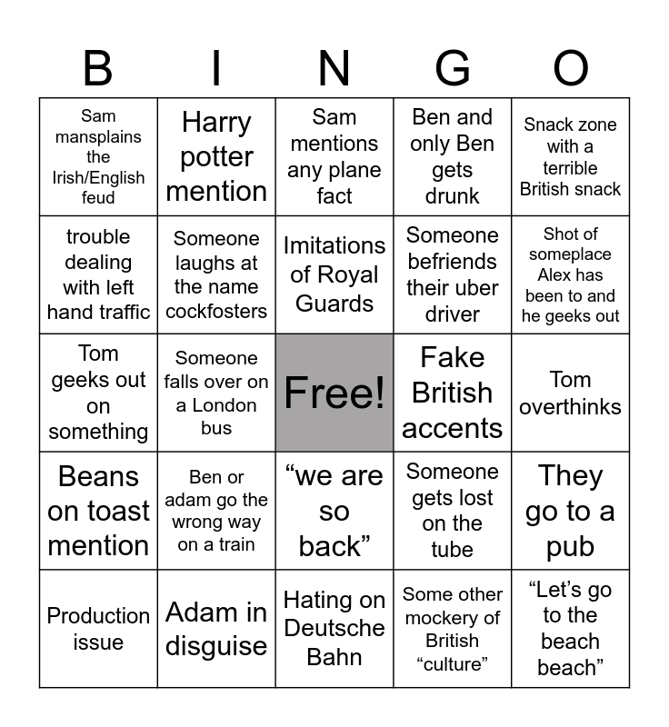 This bingo card has a free space and 24 words: Ben or adam go the wrong way on a train, Adam in disguise, Imitations of Royal Guards, Production issue, Snack zone with a terrible British snack, Sam mansplains the Irish/English feud, trouble dealing with left hand traffic, Harry potter mention, Fake British accents, “we are so back”, Someone befriends their uber driver, Tom geeks out on something, Someone gets lost on the tube, They go to a pub, Someone laughs at the name cockfosters, Some other mockery of British “culture”, Tom overthinks, Sam mentions any plane fact, Shot of someplace Alex has been to and he geeks out, Someone falls over on a London bus, “Let’s go to the beach beach”, Beans on toast mention, Ben and only Ben gets drunk and Hating on Deutsche Bahn.