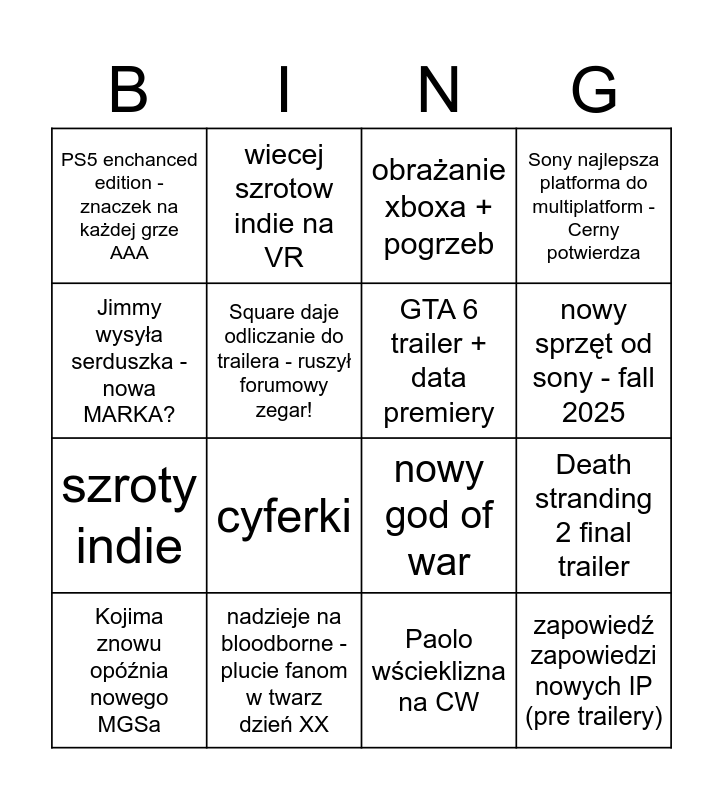 This bingo card has 16 words: nadzieje na bloodborne - plucie fanom w twarz dzień XX, Death stranding 2 final trailer, obrażanie xboxa + pogrzeb, PS5 enchanced edition - znaczek na każdej grze AAA, szroty indie, wiecej szrotow indie na VR, nowy god of war, Paolo wścieklizna na CW, Jimmy wysyła serduszka - nowa MARKA?, Square daje odliczanie do trailera - ruszył forumowy zegar!, Kojima znowu opóźnia nowego MGSa, Sony najlepsza platforma do multiplatform - Cerny potwierdza, cyferki, nowy sprzęt od sony - fall 2025, GTA 6 trailer + data premiery and zapowiedź zapowiedzi nowych IP (pre trailery).