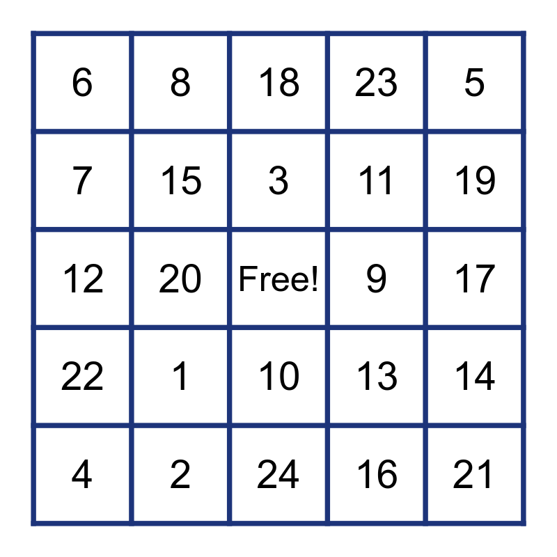 This bingo card has a free space and 24 words: 1, 2, 3, 4, 5, 6, 7, 8, 9, 10, 11, 12, 13, 14, 15, 16, 17, 18, 19, 20, 21, 22, 23 and 24.