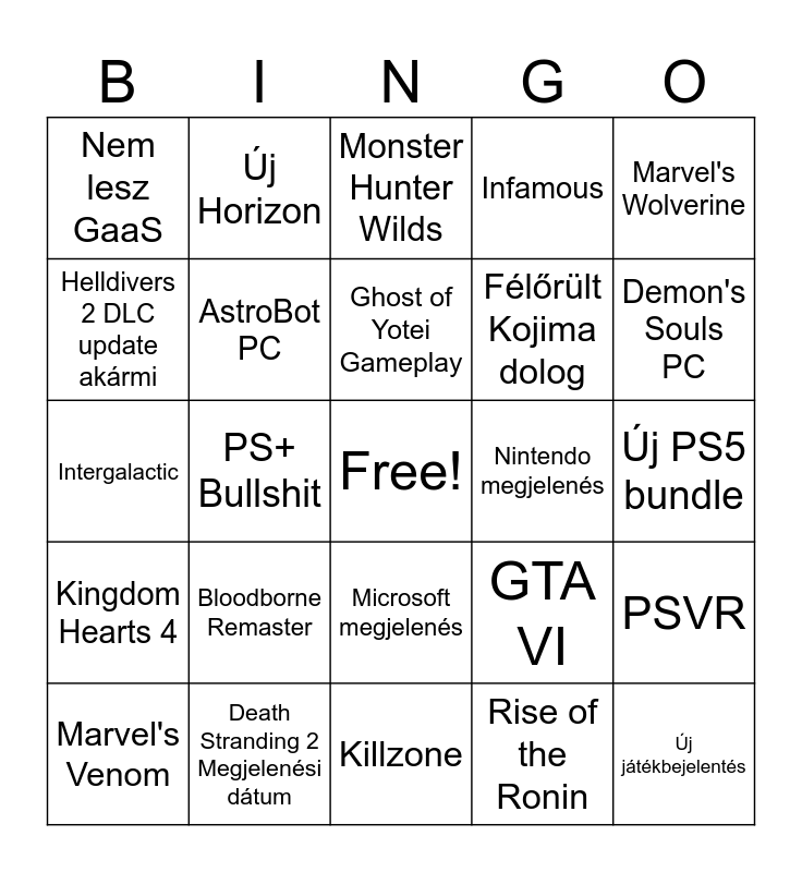 This bingo card has a free space and 24 words: Bloodborne Remaster, Death Stranding 2 Megjelenési dátum, Ghost of Yotei Gameplay, Marvel's Venom, Marvel's Wolverine, Nem lesz GaaS, Helldivers 2 DLC update akármi, Új Horizon, Nintendo megjelenés, Microsoft megjelenés, Félőrült Kojima dolog, Intergalactic, GTA VI, PSVR, AstroBot PC, Rise of the Ronin, Új PS5 bundle, Monster Hunter Wilds, Demon's Souls PC, PS+ Bullshit, Új játékbejelentés, Kingdom Hearts 4, Infamous and Killzone.