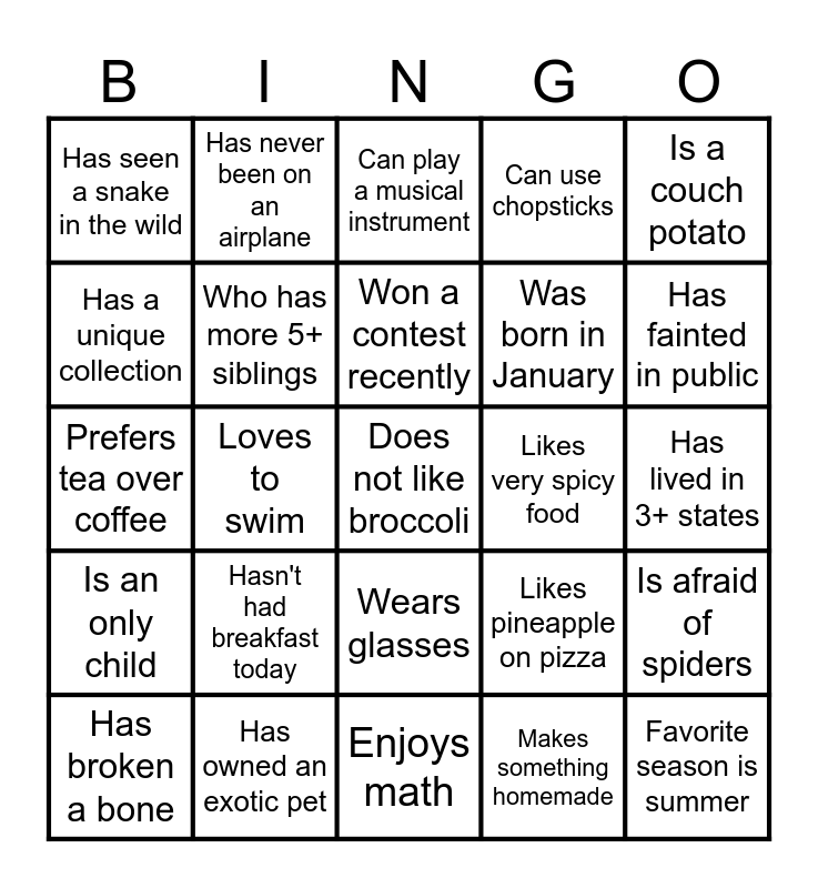 This bingo card has 25 words: Hasn't had breakfast today, Enjoys math, Won a contest recently, Has broken a bone, Is a couch potato, Has seen a snake in the wild, Has a unique collection, Has never been on an airplane, Likes very spicy food, Wears glasses, Was born in January, Prefers tea over coffee, Likes pineapple on pizza, Is afraid of spiders, Who has more 5+ siblings, Favorite season is summer, Has lived in 3+ states, Can play a musical instrument, Has fainted in public, Loves to swim, Does not like broccoli, Has owned an exotic pet, Is an only child, Can use chopsticks and Makes something homemade.
