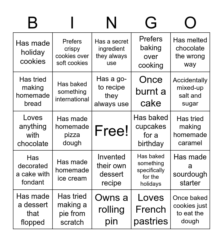 This bingo card has a free space and 28 words: Has made a sourdough starter, Prefers brownies over cookies, Once burnt a cake, Loves French pastries, Has tried making homemade bread, Has a secret ingredient they always use, Prefers crispy cookies over soft cookies, Has decorated a cake with fondant, Has baked cupcakes for a birthday, Has made a dessert that flopped, Loves anything with chocolate, Prefers baking over cooking, Has tried making a pie from scratch, Owns a rolling pin, Accidentally mixed-up salt and sugar, Loves fruit-based desserts, Has made homemade ice cream, Has baked something international, Has a go-to recipe they always use, Invented their own dessert recipe, Has made holiday cookies, Has baked a cake for a friend’s birthday, Once baked cookies just to eat the dough, Has made homemade pizza dough, Has tried making homemade caramel, Has baked something specifically for the holidays, Has melted chocolate the wrong way and Has watched a full season of a baking show.