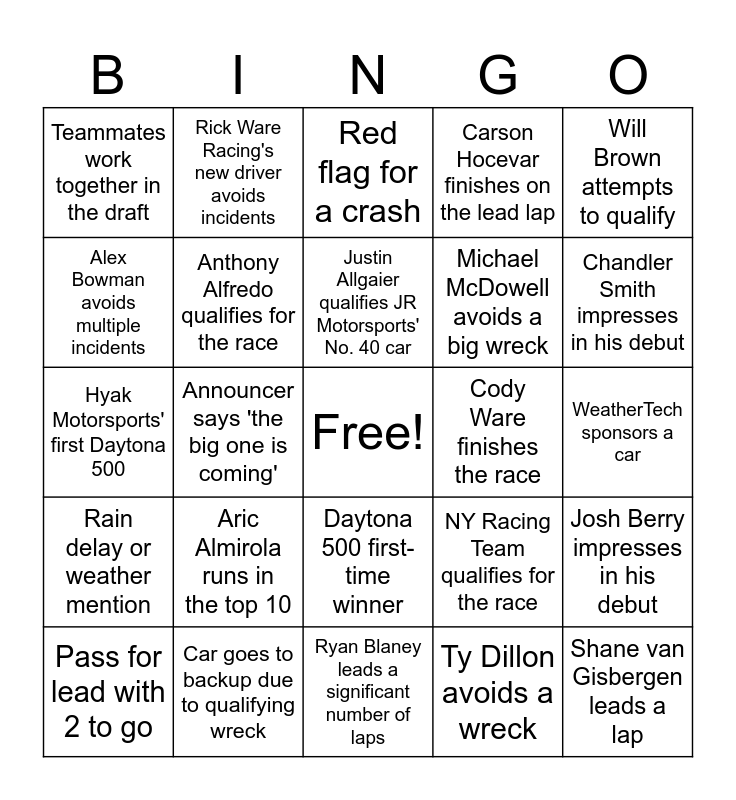 This bingo card has a free space and 111 words: Daytona 500 Bingo Entries, Big One crash, Pit road speeding penalty, Car goes airborne, Green-white-checkered finish, Car dodges wreck narrowly, Lead change in final 5 laps, Driver leads over 50 laps, Rookie in top 10, Car gets black-flagged, Someone loses a tire, Chevy in the lead, Toyota leads for 10+ laps, Ford leads for 10+ laps, Underdog in top 5, Caution within first 20 laps, Daytona 500 first-time winner, Pit strategy changes the leader, Multiple cars out in one wreck, Lucky Dog driver gets back on the lead lap, Pass for lead with 2 to go, Red flag for a crash, Manufacturer sweep of podium, Commentator mentions 'drafting partners', A car flips over, Rain delay or weather mention, Car goes to backup due to qualifying wreck, Photo finish (within 0.05 seconds), Crew chief makes risky call, Driver makes a three-wide pass for the lead, Teammates work together in the draft, Announcer says 'the big one is coming', Car makes it to pit road with heavy damage, Debris caution in the final 20 laps, Car runs out of fuel in final laps, Fan-favorite driver gets taken out in a wreck, Car spins but saves it without hitting anything, Driver wins from the back of the field, In-car camera shows intense driver reaction, Announcer references a past Daytona 500 finish, Car loses draft and struggles to keep up, Kyle Busch wins his first Daytona 500 in his 20th attempt, Jimmie Johnson qualifies for the race in his return, Martin Truex Jr. makes the field with TRICON Garage, Justin Allgaier qualifies JR Motorsports' No. 40 car, Hélio Castroneves makes his NASCAR debut, Ryan Blaney leads a significant number of laps, Denny Hamlin contends for a fourth Daytona 500 win, Joey Logano runs up front defending his championship, An underdog driver like Erik Jones or Todd Gilliland leads laps, Rookie Riley Herbst finishes in the top 10, Shane van Gisbergen impresses in his Cup Series debut, Austin Cindric shows strength as a former winner, Bubba Wallace leads multiple laps, Chase Elliott makes a late charge to the front, Tyler Reddick runs in the top five, Alex Bowman avoids multiple incidents, William Byron leads during the race, Brad Keselowski makes a bold move for the lead, Kevin Harvick announces this is his final Daytona 500, Christopher Bell wins a stage, Ross Chastain makes a daring pass, Daniel Suárez runs in the top 10, Corey LaJoie races his way into the field, Ty Gibbs has a strong showing as a rookie, Michael McDowell avoids a big wreck, Noah Gragson leads a lap in his debut, Zane Smith finishes on the lead lap, Cole Custer runs in the top 15, Anthony Alfredo qualifies for the race, Chandler Smith impresses in his debut, J.J. Yeley avoids major incidents, B.J. McLeod finishes the race, Todd Gilliland leads a lap, Harrison Burton runs in the top 10, Erik Jones contends for the win, Austin Dillon avoids a wreck, Chris Buescher makes a strategic pit stop, Justin Haley leads a lap, Aric Almirola runs in the top 10, Ricky Stenhouse Jr. makes a bold move, Ty Dillon avoids a wreck, Cody Ware finishes the race, Josh Berry impresses in his debut, A.J. Allmendinger leads a lap, Ryan Preece runs in the top 15, Carson Hocevar finishes on the lead lap, Hélio Castroneves completes the race, Shane van Gisbergen leads a lap, Connor Zilisch makes his debut, Will Brown attempts to qualify, Team AmeriVet fields a car, Garage 66 makes the race, Legacy Motor Club has a strong showing, Tricon Garage's debut race, Haas Factory Team fields a car, Hyak Motorsports' first Daytona 500, JR Motorsports' Cup debut, Trackhouse Racing's new entry performs well, 23XI Racing's third car finishes in the top 10, Front Row Motorsports' new driver leads a lap, RFK Racing's third car finishes the race, Spire Motorsports' new driver impresses, Live Fast Motorsports completes the race, NY Racing Team qualifies for the race, Rick Ware Racing's new driver avoids incidents, Beard Motorsports makes the race, MBM Motorsports rebranded as Garage 66 qualifies, Red Bull returns as a sponsor, WeatherTech sponsors a car and FedEx not sponsoring a car.