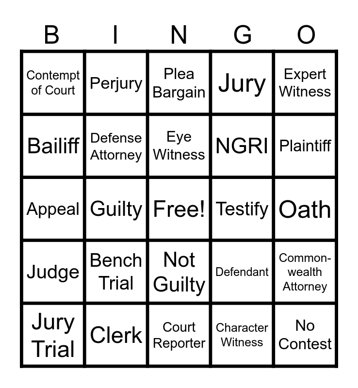 This bingo card has a free space and 24 words: Jury Trial, Bench Trial, Eye Witness, Character Witness, Expert Witness, Contempt of Court, Perjury, Plea Bargain, Testify, Oath, Appeal, Defense Attorney, Defendant, Common-wealth Attorney, Bailiff, Clerk, Court Reporter, Jury, Plaintiff, Judge, Guilty, Not Guilty, NGRI and No Contest.