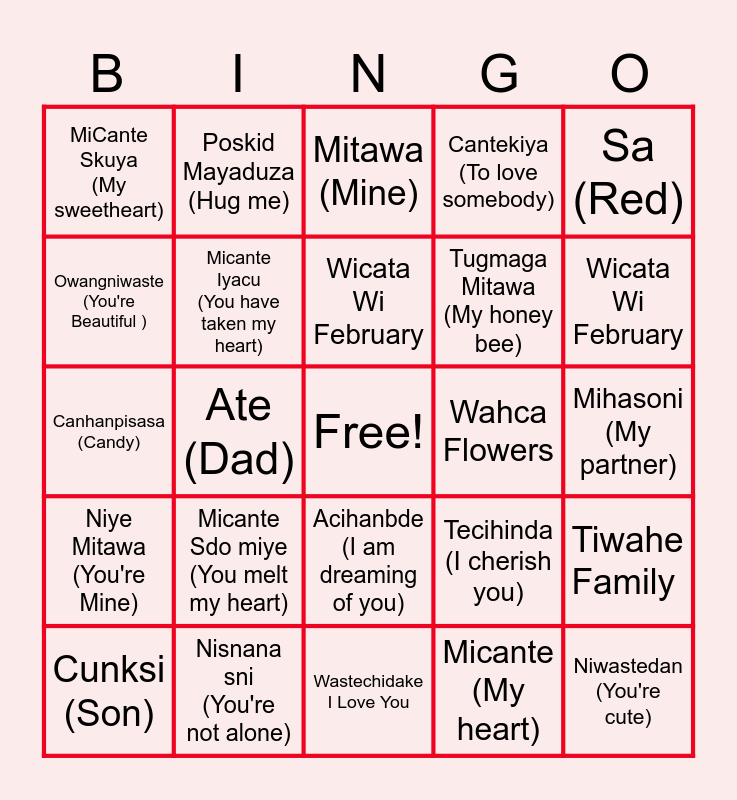 This bingo card has a free space and 27 words: Wastedake (to like something), Nisnana sni (You're not alone), Wicata Wi February, Micante (My heart), Sa (Red), Owangniwaste (You're Beautiful ), Poskid Mayaduza (Hug me), Wastechidake I Love You, Wahca Flowers, Tiwahe Family, Niye Mitawa (You're Mine), Micante Iyacu (You have taken my heart), Tecihinda (I cherish you), Niwastedan (You're cute), Canhanpisasa (Candy), Imaputaka (Kiss me), Mitawa (Mine), Cantekiya (To love somebody), Mihasoni (My partner), MiCante Skuya (My sweetheart), Micante Sdo miye (You melt my heart), Acihanbde (I am dreaming of you), Tugmaga Mitawa (My honey bee), Wicata Wi February, Cunksi (Son), Ate (Dad) and Ina Mom.