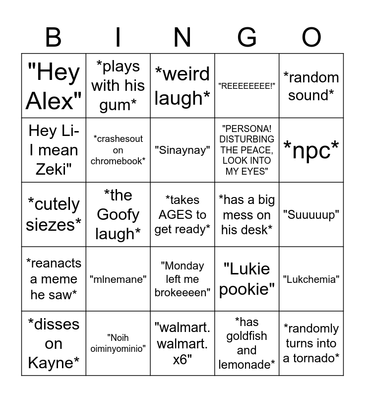 This bingo card has a free space and 24 words: "mlnemane", "Noih oiminyominio", "Sinaynay", *disses on Kayne*, *random sound*, "Hey Alex", Hey Li-I mean Zeki", *plays with his gum*, *has a big mess on his desk*, "Monday left me brokeeeen", "PERSONA! DISTURBING THE PEACE, LOOK INTO MY EYES", *cutely siezes*, "Lukie pookie", "Lukchemia", *crashesout on chromebook*, *has goldfish and lemonade*, "Suuuuup", *weird laugh*, *npc*, *the Goofy laugh*, *randomly turns into a tornado*, *reanacts a meme he saw*, "REEEEEEEE!" and "walmart. walmart. x6".