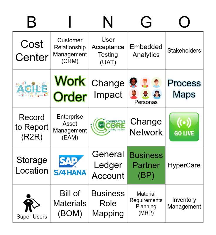This bingo card has 5 images, a free space and 21 words: Bill of Materials (BOM), Change Impact, Super Users, Stakeholders, Cost Center, Customer Relationship Management (CRM), Change Network, General Ledger Account, Personas, Record to Report (R2R), Business Partner (BP), HyperCare, Work Order, Material Requirements Planning (MRP), User Acceptance Testing (UAT), Process Maps, Enterprise Asset Management (EAM), Inventory Management, Storage Location, Embedded Analytics and Business Role Mapping.