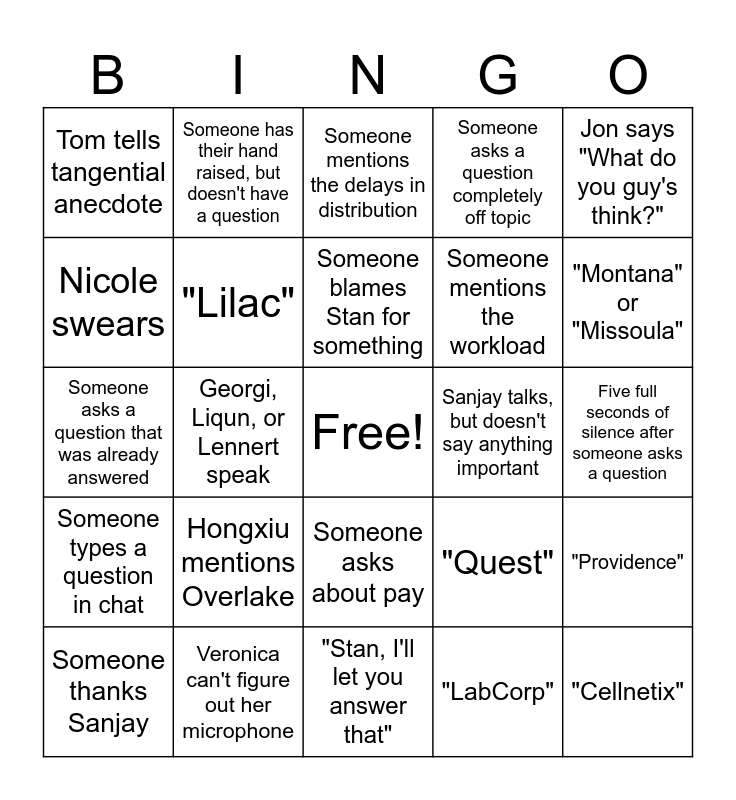 This bingo card has a free space and 24 words: Hongxiu mentions Overlake, Veronica can't figure out her microphone, Someone blames Stan for something, Someone thanks Sanjay, Jon says "What do you guy's think?", Tom tells tangential anecdote, Nicole swears, Someone has their hand raised, but doesn't have a question, Sanjay talks, but doesn't say anything important, Someone asks about pay, Someone mentions the workload, Someone asks a question that was already answered, "Quest", "Providence", "Lilac", "LabCorp", Five full seconds of silence after someone asks a question, Someone mentions the delays in distribution, "Montana" or "Missoula", Georgi, Liqun, or Lennert speak, "Cellnetix", Someone types a question in chat, Someone asks a question completely off topic and "Stan, I'll let you answer that".