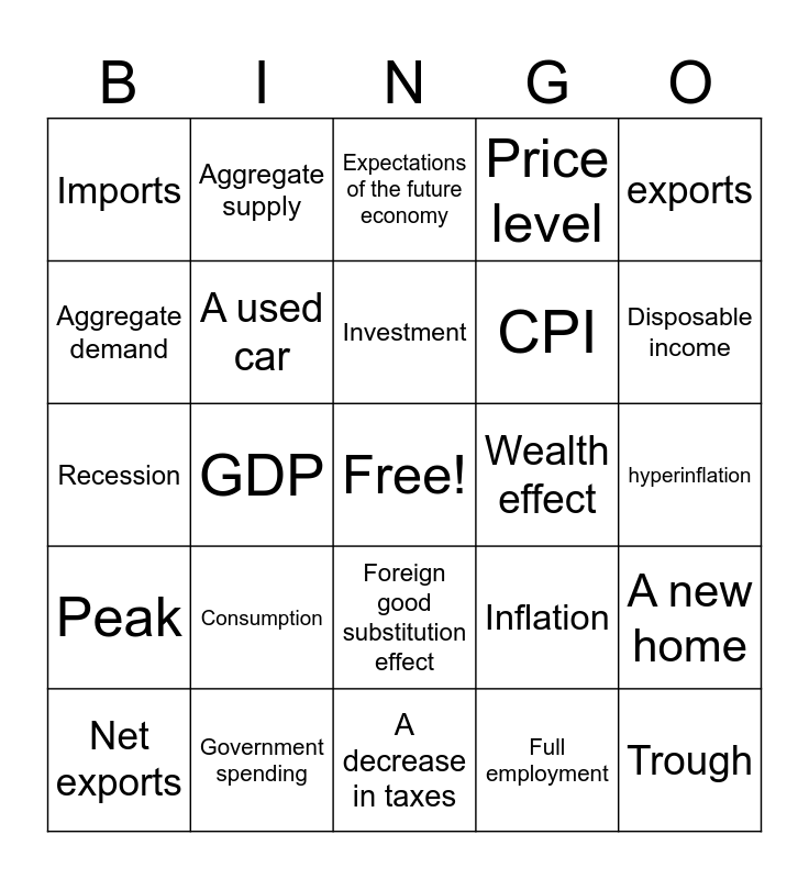 This bingo card has a free space and 24 words: Consumption, Government spending, Investment, Net exports, exports, Imports, Aggregate demand, Aggregate supply, Wealth effect, Foreign good substitution effect, CPI, Recession, Inflation, A new home, A used car, Full employment, hyperinflation, Expectations of the future economy, Disposable income, GDP, Trough, Peak, Price level and A decrease in taxes.