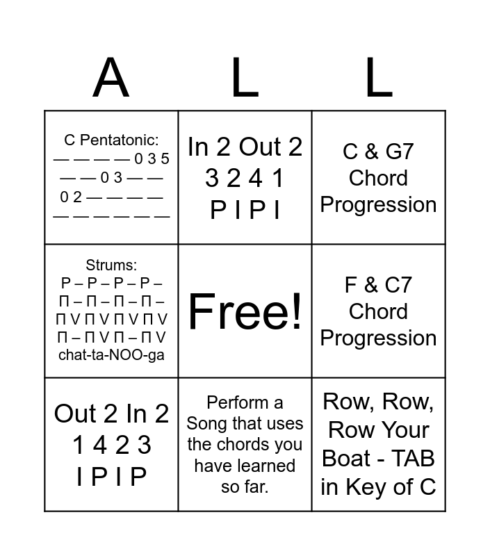 This bingo card has a free space and 8 words: F & C7 Chord Progression, C & G7 Chord Progression, In 2 Out 2 3 2 4 1 P I P I, Out 2 In 2 1 4 2 3 I P I P, C Pentatonic: — — — — 0 3 5 — — 0 3 — — 0 2 — — — — — — — — — —, Row, Row, Row Your Boat - TAB in Key of C, Strums: P – P – P – P – Π – Π – Π – Π – Π V Π V Π V Π V Π – Π V Π – Π V chat-ta-NOO-ga and Perform a Song that uses the chords you have learned so far..