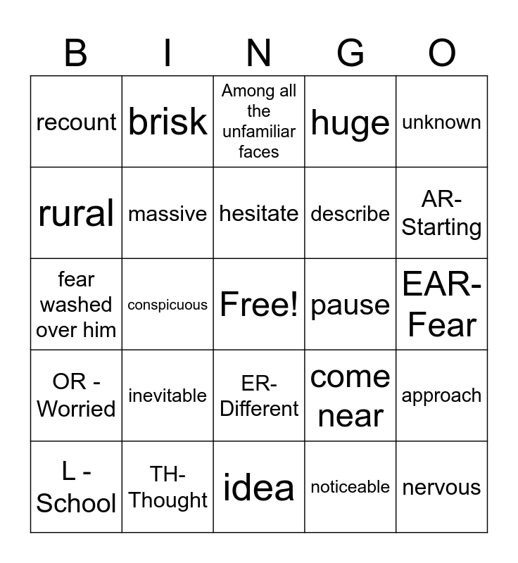 This bingo card has a free space and 48 words: apprehensive, nervous, notion, idea, inevitable, certain, brisk, fast, rural, countryside, massive, huge, approach, come near, composure, calm, hesitate, pause, unfamiliar, unknown, conspicuous, noticeable, recount, describe, L- Caleb, AR- Starting, L - School, EAR- Year, ER- Different, OR - Worried, ER- Lockers, ER- Summer, ER- Over, TH - The, TH- Thought, IR - First, ER - Searched, EAR- Fear, OR - Before, L- Familiar, TH - They, L - Relieved, Among all the unfamiliar faces, They quickly began to recount stories, fear washed over him, ER - Different, IR - Shirt and L - Easily.