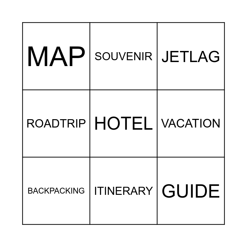 This bingo card has 12 words: LUGGAGE, GUIDE, HOTEL, VACATION, SOUVENIR, JETLAG, ITINERARY, LANDMARK, MAP, ROADTRIP, BACKPACKING and FLIGHT.