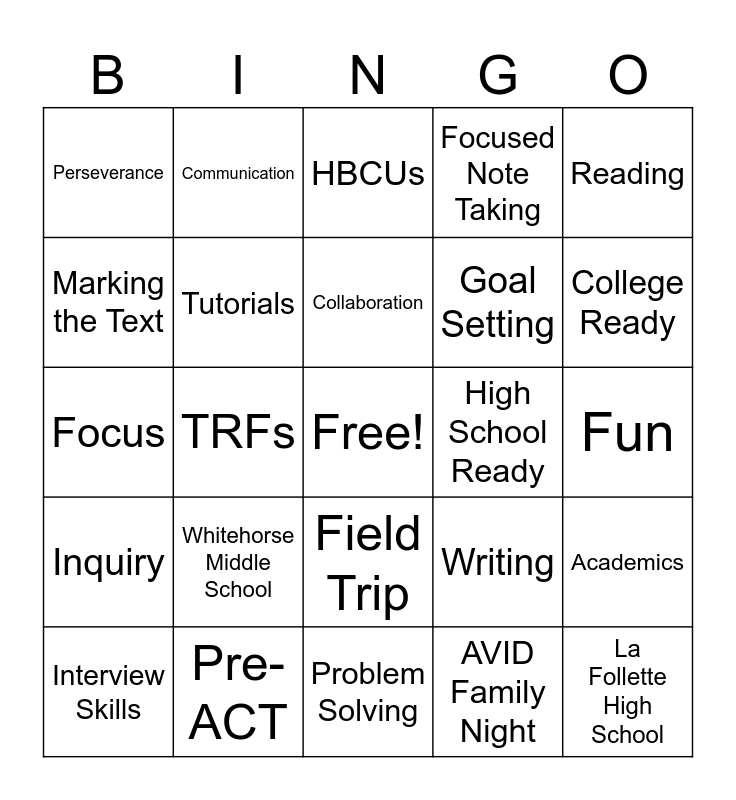 This bingo card has a free space and 36 words: AVID, AVID Family, Tutors, Tutorials, Writing, Inquiry, Collaboration, Organization, Reading, Binders, TRFs, Focused Note Taking, Teamwork, High School Ready, College Ready, Perseverance, Scholars, Whitehorse Middle School, La Follette High School, HBCUs, Fun, Academics, Pre-ACT, Interview Skills, Problem Solving, Communication, Focus, Student Responsibility, Goal Setting, Marking the Text, Management Mondays, Teamwork Tuesdays, AVID Family Night, Field Trip, Application and Interviews.