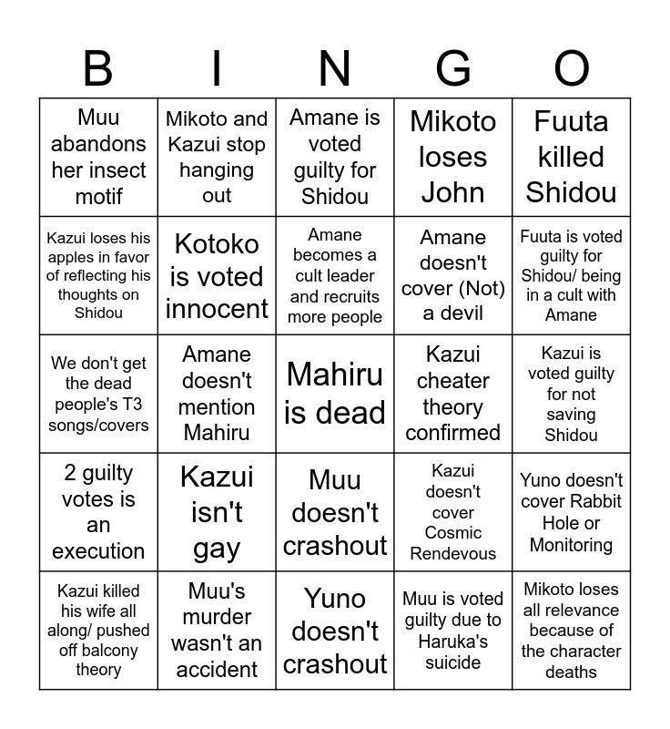 This bingo card has a free space and 24 words: Kazui isn't gay, Muu's murder wasn't an accident, Amane becomes a cult leader and recruits more people, Kazui killed his wife all along/ pushed off balcony theory, Fuuta killed Shidou, Muu abandons her insect motif, Kazui loses his apples in favor of reflecting his thoughts on Shidou, Mikoto and Kazui stop hanging out, Kazui cheater theory confirmed, Muu doesn't crashout, Amane doesn't cover (Not) a devil, We don't get the dead people's T3 songs/covers, Kazui doesn't cover Cosmic Rendevous, Yuno doesn't cover Rabbit Hole or Monitoring, Kotoko is voted innocent, Muu is voted guilty due to Haruka's suicide, Kazui is voted guilty for not saving Shidou, Amane is voted guilty for Shidou, Fuuta is voted guilty for Shidou/ being in a cult with Amane, Amane doesn't mention Mahiru, Mikoto loses all relevance because of the character deaths, 2 guilty votes is an execution, Mikoto loses John and Yuno doesn't crashout.