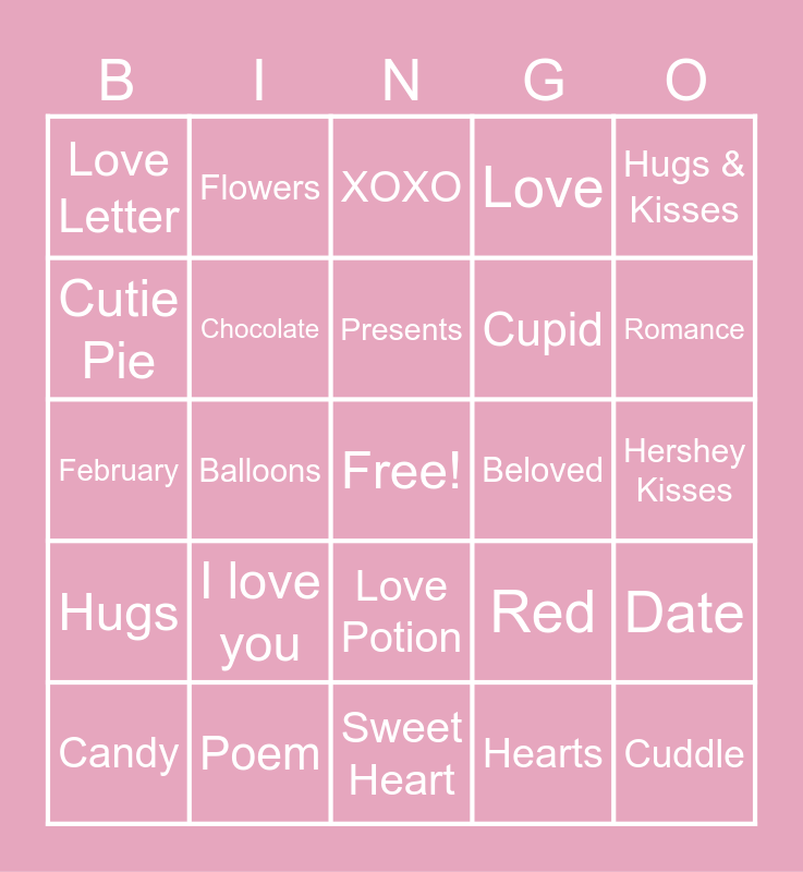 This bingo card has a free space and 40 words: Affection, Balloons, Be Mine, Beloved, Bow and Arrow, Candy, Chocolate, Crush, Cupid, Date, February, Flowers, Hearts, Hershey Kisses, Hugs, I love you, Kisses, Love, Love Birds, Love Letter, Poem, Presents, Red, Romance, Rose, Secret Admirer, Sweet Heart, Teddy Bear, True Love, Valentines Cards, Valentines Day, XOXO, Flirt, Cuddle, Cutie Pie, Amore, Love Potion, Call me, Hugs & Kisses and Strawberries.