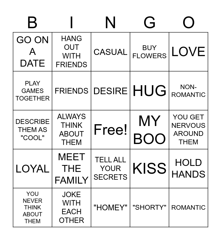 This bingo card has a free space and 24 words: MEET THE FAMILY, JOKE WITH EACH OTHER, DESIRE, YOU NEVER THINK ABOUT THEM, LOVE, GO ON A DATE, PLAY GAMES TOGETHER, HANG OUT WITH FRIENDS, MY BOO, TELL ALL YOUR SECRETS, HUG, DESCRIBE THEM AS "COOL", KISS, HOLD HANDS, FRIENDS, "SHORTY", YOU GET NERVOUS AROUND THEM, CASUAL, NON-ROMANTIC, ALWAYS THINK ABOUT THEM, ROMANTIC, LOYAL, BUY FLOWERS and "HOMEY".