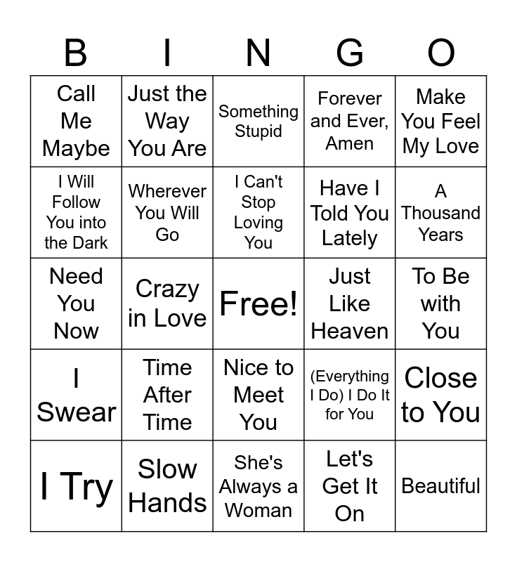 This bingo card has a free space and 56 words: What About Us, I Try, Nothing Compares 2 U, Call Me Maybe, She's Always a Woman, Wonderful Tonight, Wherever You Will Go, Stand by Me, Have I Told You Lately, Truly Madly Deeply, Forever and Ever, Amen, Unforgettable, We've Got Tonight, Can't Take My Eyes off You, You and Me, Fallin', Make You Feel My Love, Crazy in Love, Lady, Beautiful, Just Like Heaven, Drops of Jupiter, (Everything I Do) I Do It for You, Something Stupid, Careless Whisper, I Can't Stop Loving You, Someone You Loved, Eternal Flame, A Thousand Years, Let's Stay Together, Beauty and the Beast, Your Man, With or Without You, Hero, To Be with You, I Will Follow You into the Dark, Need You Now, Can You Feel the Love Tonight, I Swear, Just the Way You Are, Nice to Meet You, Put Your Records On, Can't Help Falling in Love, Stone in Love, Sweet Pea, Time After Time, Slow Hands, At Last, How Do I Live, Haven't Met You Yet, Let's Get It On, I Want to Know What Love Is, Lovely Day, My Love, Close to You and I Just Called to Say I Love You.