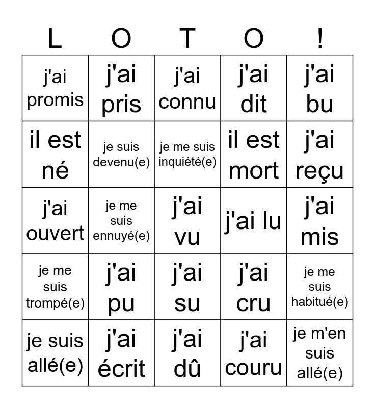 This bingo card has 43 words: j'ai été, j'ai vu, j'ai eu, je suis allé(e), j'ai conduit, j'ai couru, j'ai connu, j'ai fait, j'ai bu, j'ai écrit, j'ai dit, j'ai lu, j'ai su, j'ai pu, j'ai voulu, j'ai dû, il a plu, j'ai ouvert, j'ai vécu, j'ai reçu, j'ai pris, j'ai compris, j'ai appris, j'ai promis, j'ai permis, j'ai mis, j'ai ri, j'ai suivi, j'ai cru, je me suis trompé(e), je me suis détendu(e), je me suis habitué(e), je me suis dépêché(e), je me suis ennuyé(e), je me suis demandé(e), je me suis intéressé(e), je m'en suis allé(e), je me suis inquiété(e), il est né, il est mort, je suis venu(e), je suis devenu(e) and je suis revenu(e).