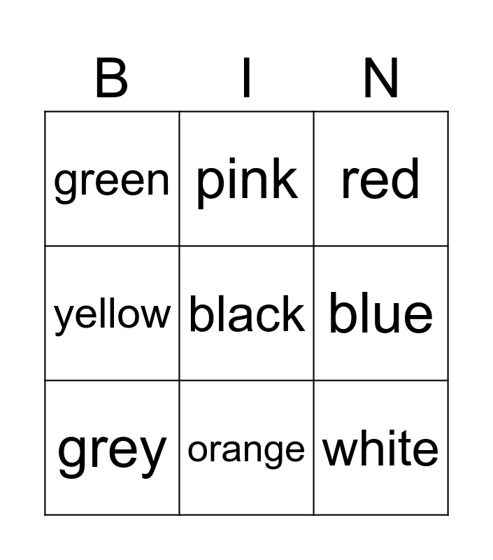 This bingo card has 11 words: white, orange, black, grey, pink, red, blue, brown, yellow, green and purple.