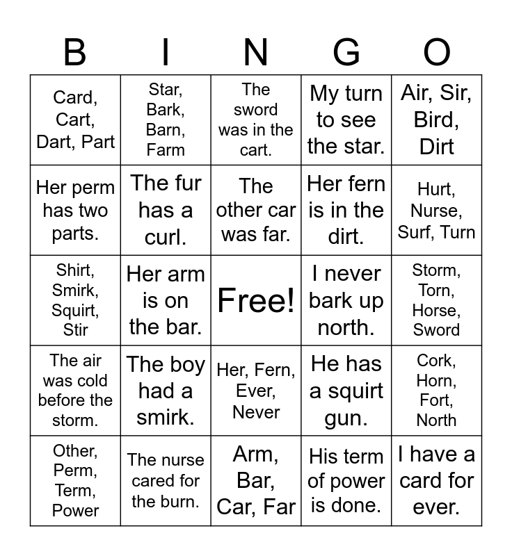 This bingo card has a free space and 25 words: The boy had a smirk., Arm, Bar, Car, Far, The other car was far., Other, Perm, Term, Power, Air, Sir, Bird, Dirt, Card, Cart, Dart, Part, Her perm has two parts., Star, Bark, Barn, Farm, I never bark up north., Her, Fern, Ever, Never, Her fern is in the dirt., Shirt, Smirk, Squirt, Stir, He has a squirt gun., Cork, Horn, Fort, North, The fur has a curl., Fur, Burn, Blur, Curl, Storm, Torn, Horse, Sword, The sword was in the cart., Hurt, Nurse, Surf, Turn, Her arm is on the bar., I have a card for ever., The nurse cared for the burn., The air was cold before the storm., My turn to see the star. and His term of power is done..