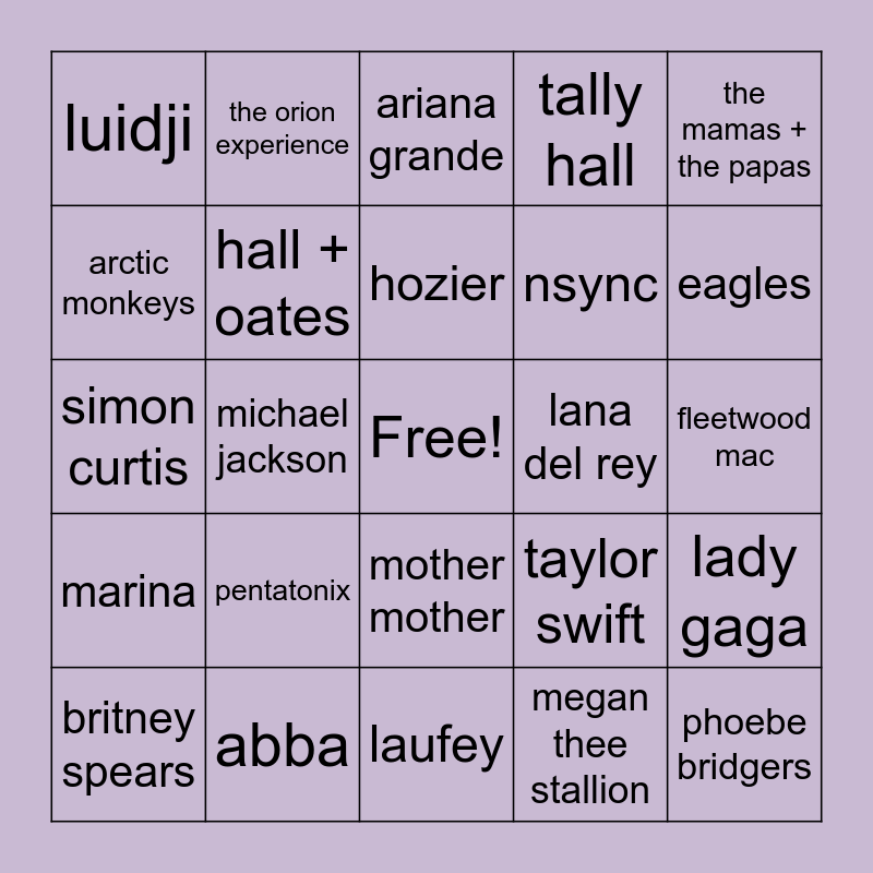 This bingo card has a free space and 24 words: pentatonix, abba, hozier, britney spears, the mamas + the papas, luidji, arctic monkeys, the orion experience, lana del rey, mother mother, nsync, simon curtis, taylor swift, lady gaga, hall + oates, megan thee stallion, fleetwood mac, ariana grande, eagles, michael jackson, phoebe bridgers, marina, tally hall and laufey.