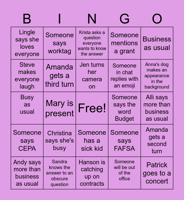 This bingo card has a free space and 24 words: Christina says she's busy, Sandra knows the answer to an obscure question, Jen turns her camera on, Andy says more than business as usual, Business as usual, Lingle says she loves everyone, Steve makes everyone laugh, Someone says worktag, Someone says the word Budget, Someone has a sick kid, Someone in chat replies with an emoji, Busy as usual, Someone says FAFSA, Amanda gets a second turn, Amanda gets a third turn, Someone will be out of the office, Alli says more than business as usual, Krista asks a question everyone wants to know the answer, Anna's dog makes an appearance in the background, Mary is present, Patrick goes to a concert, Someone says CEPA, Someone mentions a grant and Hanson is catching up on contracts.
