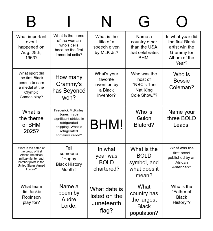 This bingo card has a free space and 24 words: Tell someone "Happy Black History Month"!, Name a poem by Audre Lorde., What's your favorite invention by a Black inventor?, What team did Jackie Robinson play for?, In what year did the first Black artist win the Grammy for Album of the Year?, What important event happened on Aug. 28th, 1963?, What sport did the first Black person to earn a medal at the Olympic Games play?, What is the name of the woman who's cells became the first immortal cells?, Who is Guion Bluford?, In what year was BOLD chartered?, Who was the host of "NBC’s The Nat King Cole Show."?, What is the theme of BHM 2025?, What is the BOLD symbol, and what does it mean?, What was the first novel published by an African American?, How many Grammy's has Beyoncé won?, What country has the largest Black population?, Name your three BOLD Leads., What is the title of a speech given by MLK Jr.?, Who is Bessie Coleman?, Frederick McKinley Jones made significant strides in refrigerated shipping. What is refrigerated container called?, Who is the “Father of Black History”?, What is the name of the group of first African American military fighter and bomber pilots in the United States Armed Forces?, Name a country other than the USA that celebrates BHM. and What date is listed on the Juneteenth flag?.