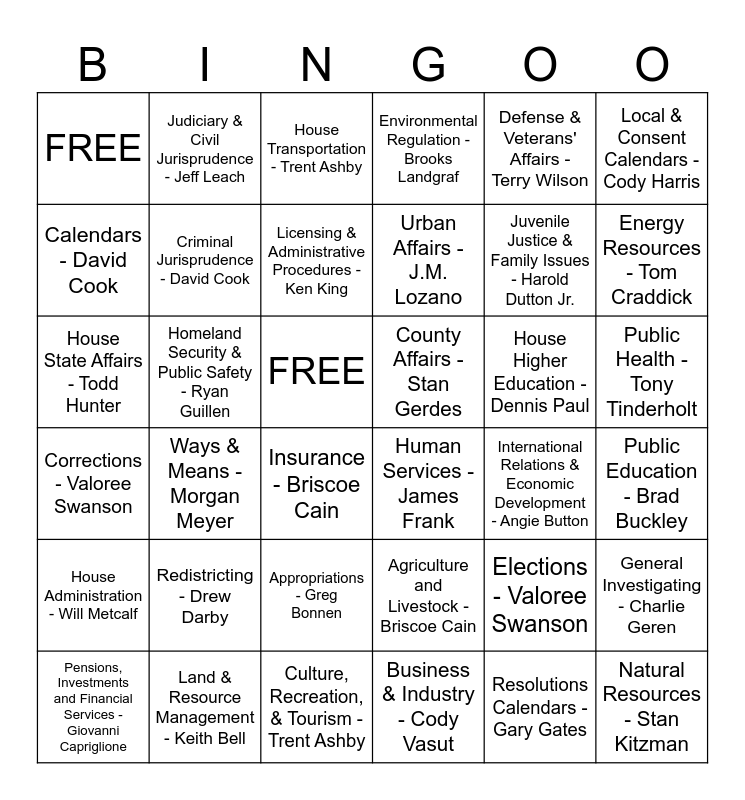 This bingo card has 36 words: Agriculture and Livestock - Briscoe Cain, Appropriations - Greg Bonnen, Business & Industry - Cody Vasut, Calendars - David Cook, Corrections - Valoree Swanson, County Affairs - Stan Gerdes, Criminal Jurisprudence - David Cook, Culture, Recreation, & Tourism - Trent Ashby, Defense & Veterans' Affairs - Terry Wilson, Elections - Valoree Swanson, Energy Resources - Tom Craddick, Environmental Regulation - Brooks Landgraf, General Investigating - Charlie Geren, Homeland Security & Public Safety - Ryan Guillen, Urban Affairs - J.M. Lozano, FREE, House Administration - Will Metcalf, House Higher Education - Dennis Paul, House State Affairs - Todd Hunter, House Transportation - Trent Ashby, FREE, Ways & Means - Morgan Meyer, Human Services - James Frank, Insurance - Briscoe Cain, International Relations & Economic Development - Angie Button, Judiciary & Civil Jurisprudence - Jeff Leach, Juvenile Justice & Family Issues - Harold Dutton Jr., Land & Resource Management - Keith Bell, Licensing & Administrative Procedures - Ken King, Local & Consent Calendars - Cody Harris, Natural Resources - Stan Kitzman, Pensions, Investments and Financial Services - Giovanni Capriglione, Public Education - Brad Buckley, Public Health - Tony Tinderholt, Redistricting - Drew Darby and Resolutions Calendars - Gary Gates.
