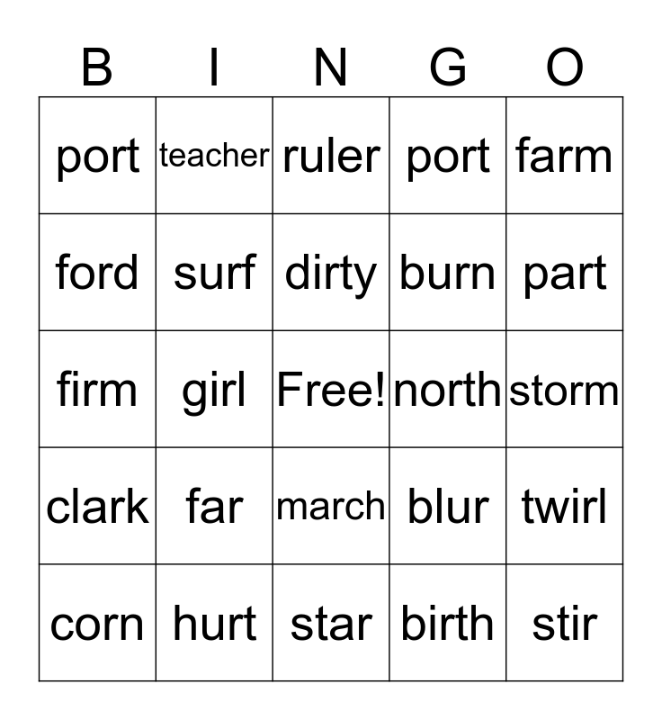 This bingo card has a free space and 24 words: far, hurt, dirty, corn, farm, port, ford, teacher, north, march, burn, firm, blur, twirl, surf, birth, storm, ruler, part, girl, stir, clark, port and star.