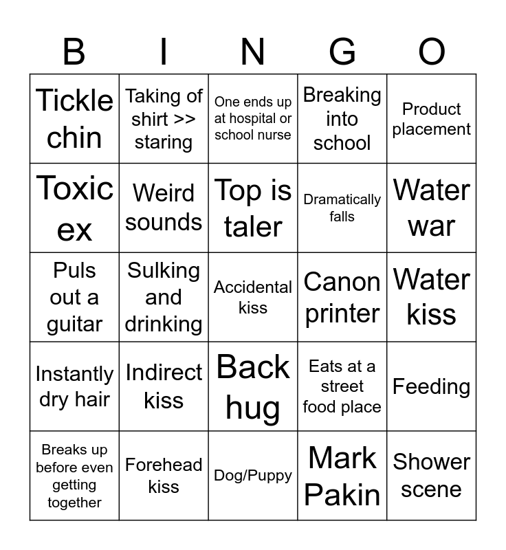 This bingo card has 94 words: Pretends to sleep, Sleeping with lights on, Dog/Puppy, Goofy shirts, Invites themselves over, Sticky note message, Checks for fever, Breaks up before even getting together, Stargazing, Slaps head, Pats head, The stairs, AJ/JJ, Dramatically falls, Karaoke, Product placement, One ends up at hospital or school nurse, Stopped by the wrist, Break up, Over dramatic music, Dragging arm, Likes eating spicy stuff/ hates it, Healing wound, Wipe off body, Indirect kiss, Weird sounds, Forgets bag, Shower scene, Beach trip, Mountain trip, Forehead kiss, Back hug, Mutual pinning, Sharing bed, Taking of shirt >> staring, Big age gap, Football tournament, Swimming club, Top is taler, Eats at a street food place, Puls out a guitar, Instantly dry hair, Water kiss, Night in one second, Accidental kiss, Dumb friend(s), Dead parent(s), Leaning on shoulder, Cheek sniff/kiss, Engineers, ep 11 curse, Mark Pakin, Homophobic parent(s), Coming out, Time skip, Drake, In college, Oishi, Lays, Enemies to lovers, Sulking and drinking, Physical fight, Rich boy, Temple, Monk offerings, Slay grandma or aunt, Splashing/ spilling drink, Helping putting on/taking off helmet, Toxic ex, Banger intro, Loi krathong, Mall scene, Protects the other from rain, Art students, Breaking into school, Cheating, Sitting on swings, Water war, Feeding, Gifts a bracelet, Starts to hit on the other after they already confessed/kissed, Fingers, Taking off glasses glow-up, Canon printer, Tickle chin, Charing headphones, Smells themselves, Framed picture of themselve, Punished for getting late, Forced to study abroad/wants to, Doc, Papang, Heartbeat sounds and Ikea or something else swedish.
