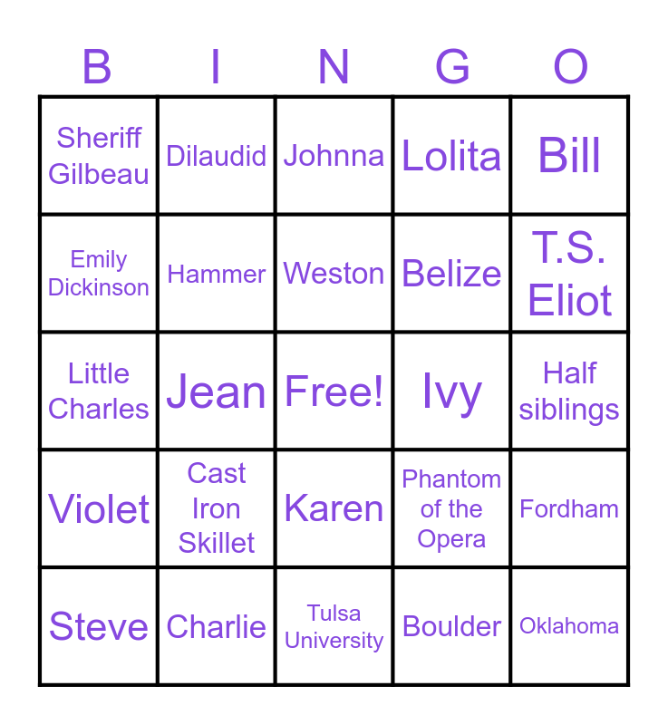 This bingo card has a free space and 29 words: Steve, Mattie Fae, Jean, Barbara, Sheriff Gilbeau, Johnna, Hammer, Cast Iron Skillet, Ivy, Charlie, Half siblings, Oklahoma, Tulsa University, Boulder, T.S. Eliot, Eric Clapton, Karen, Violet, Bill, Little Charles, Phantom of the Opera, New York, Belize, Emily Dickinson, Lolita, Dilaudid, Fordham, Weston and parakeets.