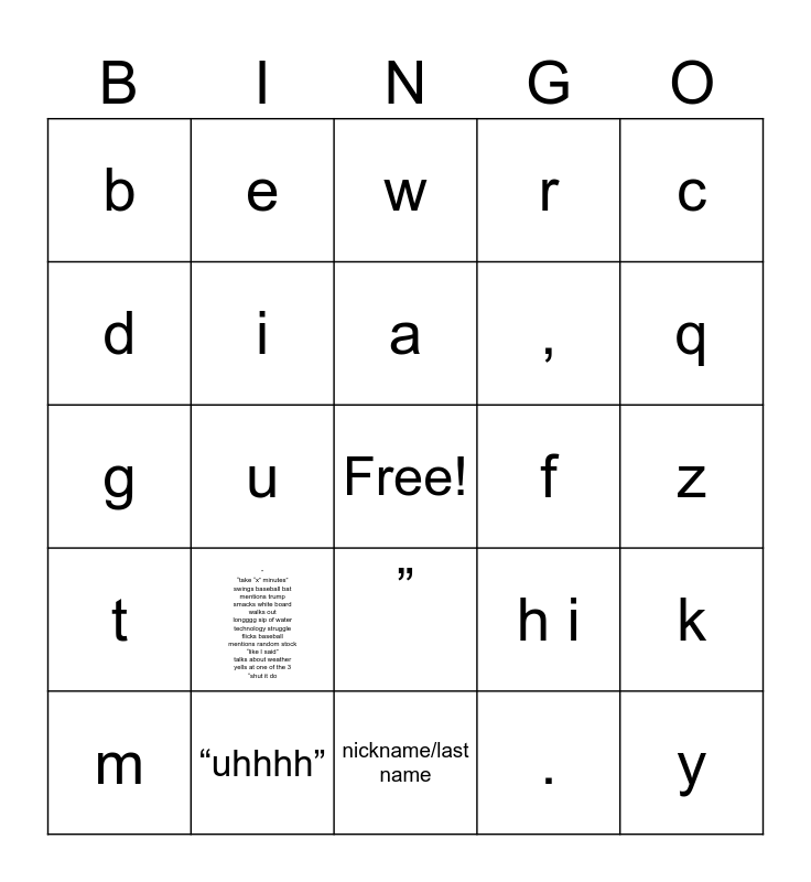 This bingo card has a free space and 24 words: ” “take “x” minutes” swings baseball bat mentions trump smacks white board walks out longggg sip of water technology struggle flicks baseball mentions random stock “like I said” talks about weather yells at one of the 3 “shut it do, “uhhhh”, a, m, c, b, d, e, f, ”, ,, g, h i, k, i, ., z, w, q, u, y, t, r and nickname/last name.