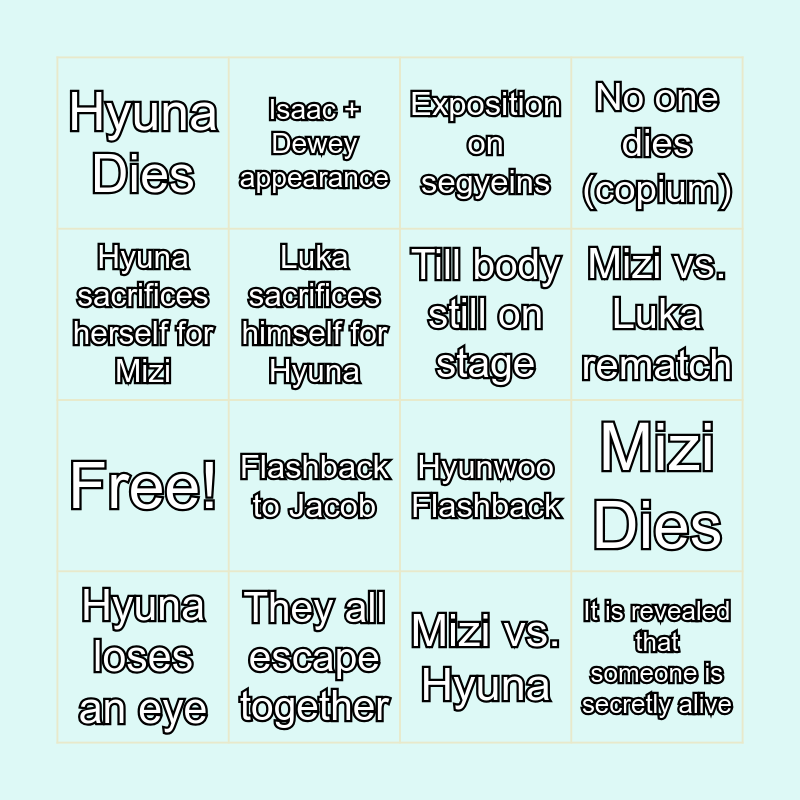 This bingo card has 20 words: Mizi Dies, Double death, Exposition on segyeins, Hyuna amputation, Hyuna loses an eye, Hyuna sacrifices herself for Mizi, They all escape together, Hyuna Dies, Free!, Isaac + Dewey appearance, Flashback to Jacob, Hyunwoo Flashback, Luka sacrifices himself for Hyuna, It is revealed that someone is secretly alive, Till body still on stage, Luka Dies, Mizi vs. Luka rematch, No one dies (copium), Mizi vs. Hyuna and Isaac/Dewey death.