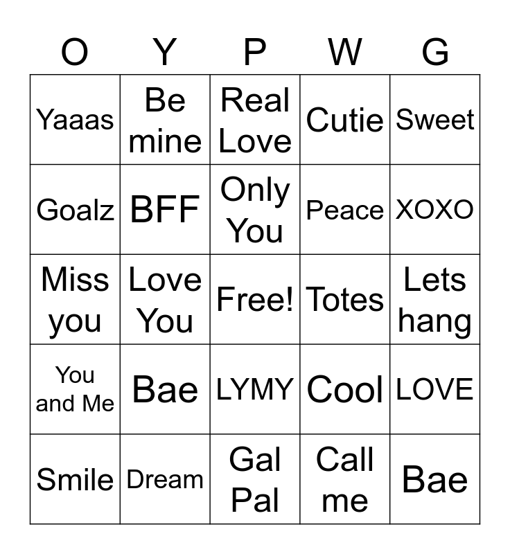 This bingo card has a free space and 24 words: Smile, Bae, Only You, Call me, Sweet, Yaaas, Be mine, Real Love, Totes, Lets hang, Miss you, BFF, Cool, LOVE, Goalz, Dream, Gal Pal, Cutie, XOXO, You and Me, Love You, LYMY, Peace and Bae.