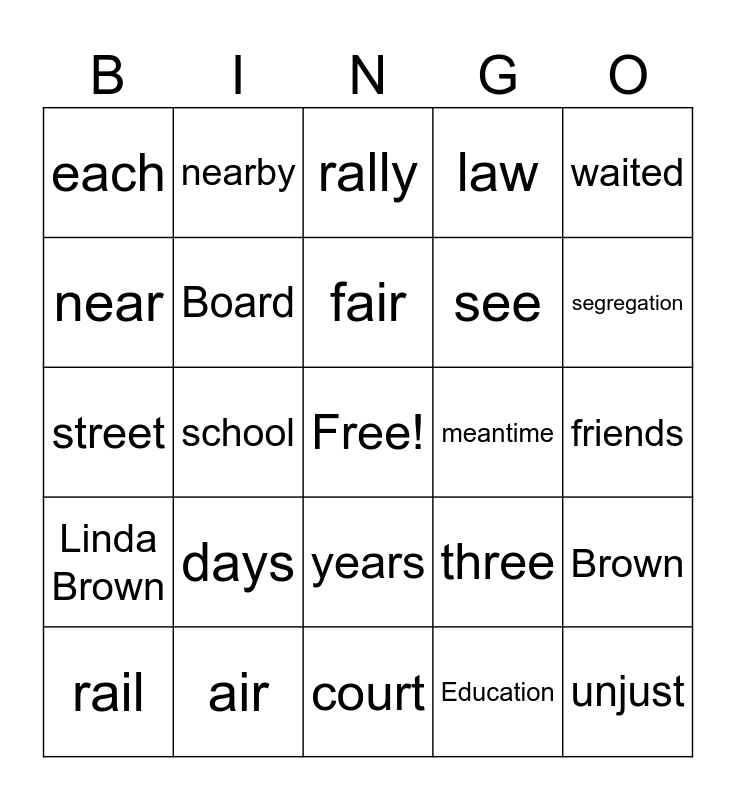 This bingo card has a free space and 24 words: days, air, fair, rail, waited, each, near, nearby, meantime, years, see, street, three, Brown, Board, Education, friends, rally, segregation, school, unjust, Linda Brown, law and court.