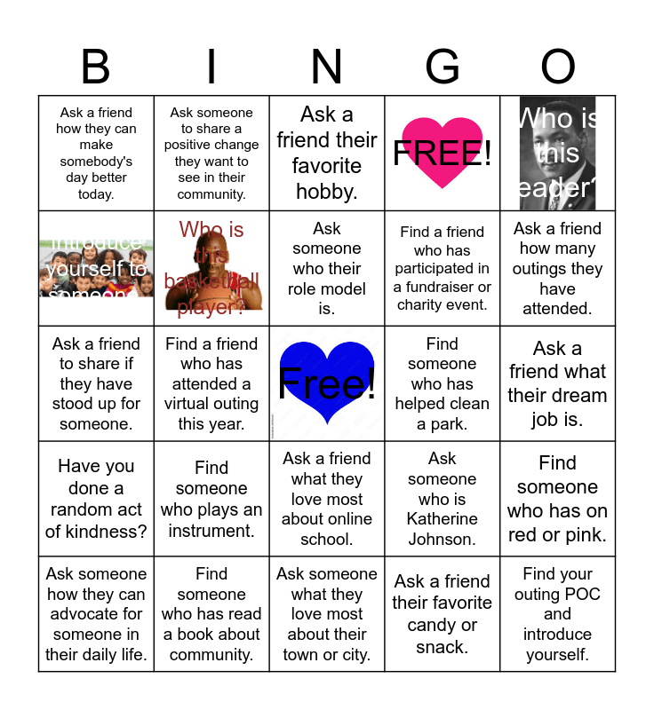 This bingo card has 4 images, a free space and 24 words: Find someone who plays an instrument., Find someone who has read a book about community., Ask someone who their role model is., Ask someone how they can advocate for someone in their daily life., Who is this leader?, Ask a friend how they can make somebody's day better today., Introduce yourself to someone., Ask someone to share a positive change they want to see in their community., Find someone who has helped clean a park., Ask a friend what they love most about online school., Find a friend who has participated in a fundraiser or charity event., Ask a friend to share if they have stood up for someone., Ask someone who is Katherine Johnson., Find someone who has on red or pink., Who is this basketball player?, Ask a friend their favorite candy or snack., Ask a friend what their dream job is., Ask a friend their favorite hobby., Ask a friend how many outings they have attended., Find a friend who has attended a virtual outing this year., Find your outing POC and introduce yourself., Have you done a random act of kindness?, FREE! and Ask someone what they love most about their town or city..