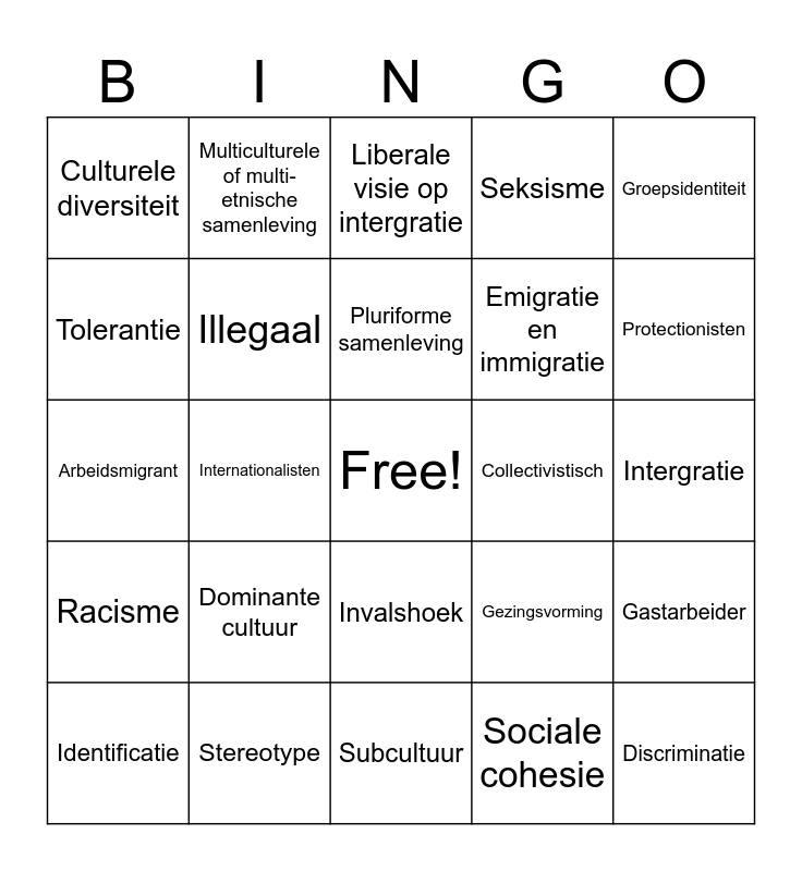 This bingo card has a free space and 25 words: Dominante cultuur, Subcultuur, Pluriforme samenleving, Identificatie, Groepsidentiteit, Culturele diversiteit, Tolerantie, Multiculturele of multi-etnische samenleving, Collectivistisch, Invalshoek, Emigratie en immigratie, Arbeidsmigrant, Gezingsvorming, Gastarbeider, Illegaal, Segregatie, Intergratie, Liberale visie op intergratie, Protectionisten, Internationalisten, Discriminatie, Stereotype, Racisme, Seksisme and Sociale cohesie.