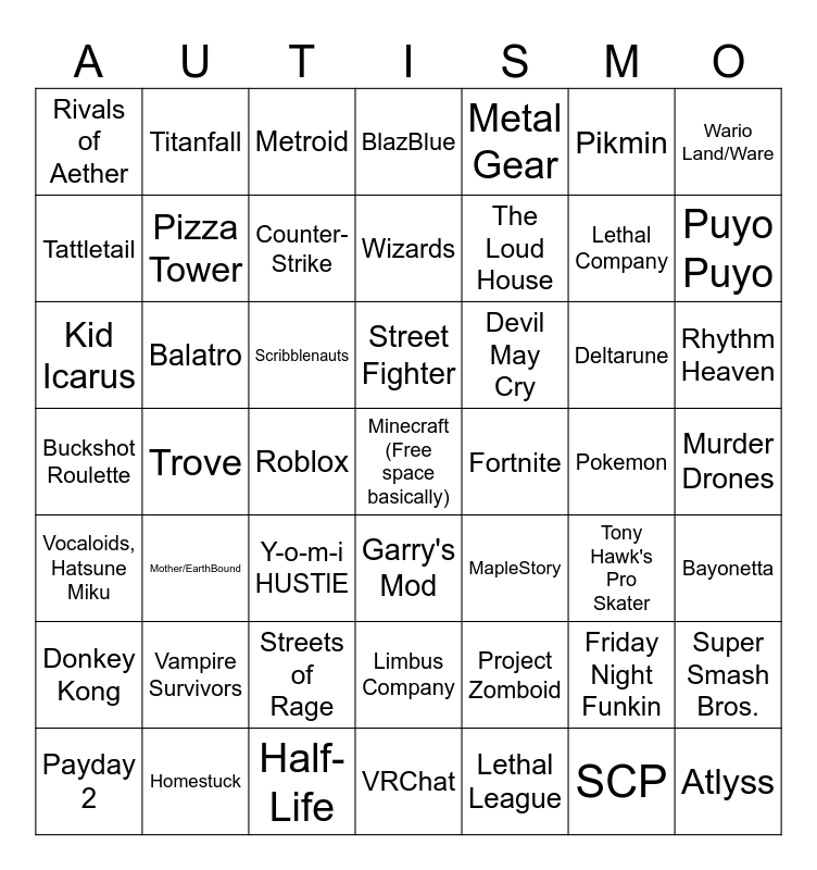 This bingo card has a free space and 131 words: Terraria, Titanfall, Limbus Company, Celeste, Helldivers, The Legend of Zelda, Balatro, Team Fortress, Fortnite, Half-Life, Persona, Undertale, Super Smash Bros., Super Mario, Hotline Miami, Hollow Knight, Roblox, Ultrakill, Guilty Gear, Geometry Dash, Pokemon, Lethal Company, Pizza Tower, The Binding of Isaac, The Amazing Digital Circus, Murder Drones, The Loud House, Friday Night Funkin, Skibidi Toilet, Splatoon, BlazBlue, Deltarune, Counter-Strike, Atlyss, Omori, SMG4, JoJo's Bizarre Adventure, Dragon Ball, One Piece, Bendy and the Ink Machine, Tattletail, Five Nights at Freddy's, Star Wars, Marvel, DC Comics, Sonic the Hedgehog, Portal, Garry's Mod, My Little Pony, Homestuck, Halo, SCP, Yume Nikki, Naruto, SpongeBob SquarePants, Deadlock, Digimon, Quake, Among Us, Buckshot Roulette, Unreal Tournament, Vocaloids, Hatsune Miku, DOOM, Grand Theft Auto, Red Dead Redemption, Tony Hawk's Pro Skater, Don't Hug Me I'm Scared, Henry Stickmin, Wizards, Tekken, Street Fighter, Hoyoverse, Project Zomboid, Krunker, Dead By Daylight, Left 4 Dead, Hazbin Hotel, Helluva Boss, MapleStory, Mabinogi, Payday 2, Boring Man: OTSC, Don't Starve, Rivals of Aether, Scribblenauts, Unturned, Cuphead, Puyo Puyo, Tetris, Trove, Brawlhalla, BattleBit, The King of Fighters, Lethal League, Baldi's Basics, VRChat, Y-o-m-i HUSTlE, Metal Gear, Animal Crossing, Pikmin, Star Fox, Donkey Kong, Metroid, Kirby, Fire Emblem, Mother/EarthBound, F-Zero, Kid Icarus, Thomas the Tank Engine, Rhythm Heaven, Advance Wars, Wario Land/Ware, Mario & Luigi, Cookie Run, Phantasy Star, Streets of Rage, Virtua Fighter, Crazy Taxi, Shenmue, Yakuza, Like A Dragon, Bayonetta, Super Monkey Ball, Spooky's Jumpscare Mansion, Plants vs Zombies, Bloons Tower Defense, Vampire Survivors, Stardew Valley, Devil May Cry, Postal, Lobotomy Corporation, Backrooms and Rubik's Cube.