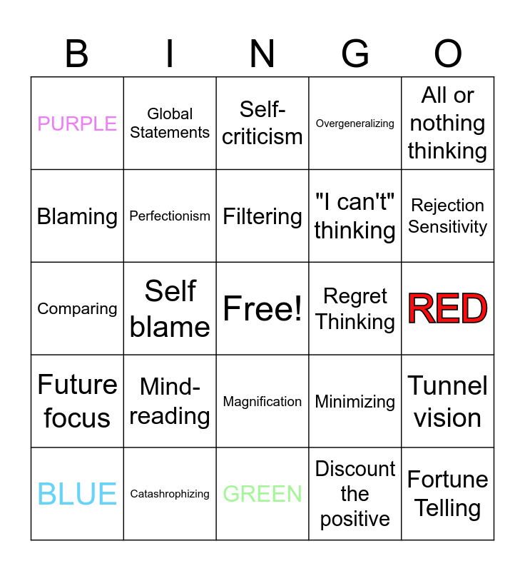 This bingo card has a free space and 24 words: Mind-reading, Catashrophizing, Filtering, BLUE, All or nothing thinking, PURPLE, Blaming, Global Statements, Regret Thinking, Magnification, "I can't" thinking, Comparing, Minimizing, Tunnel vision, Perfectionism, Discount the positive, RED, Self-criticism, Rejection Sensitivity, Self blame, Fortune Telling, Future focus, Overgeneralizing and GREEN.