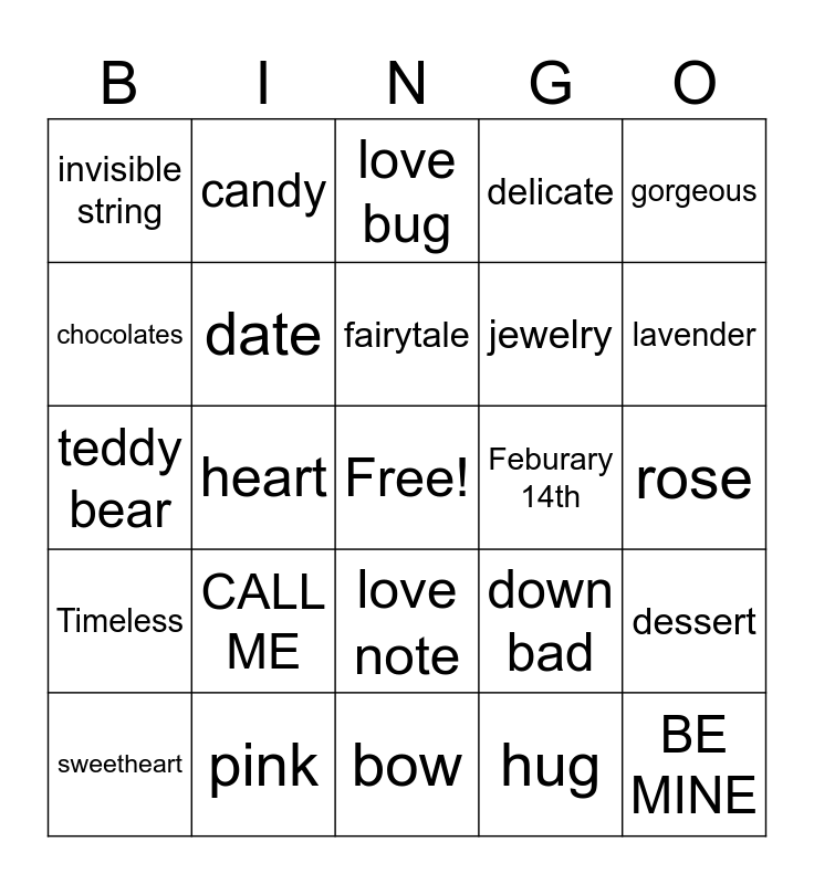This bingo card has a free space and 50 words: arrow, BE MINE, blush, bow, CALL ME, candle, candy, champagne, chocolates, cupid, date, delicate, dessert, down bad, dress, enchanted, fairytale, Feburary 14th, flowers, gorgeous, heart, hug, invisible string, jewelry, Juliet, kiss, lavender, LOML, love bug, love note, love story, love song, lover, Paris, pink, puppy love, red, rings, Romeo, rose, Secret Admirer, Self Love, Soulmate, Starlight, sweetheart, teddy bear, TEXT ME, the one, Timeless and valentine card.