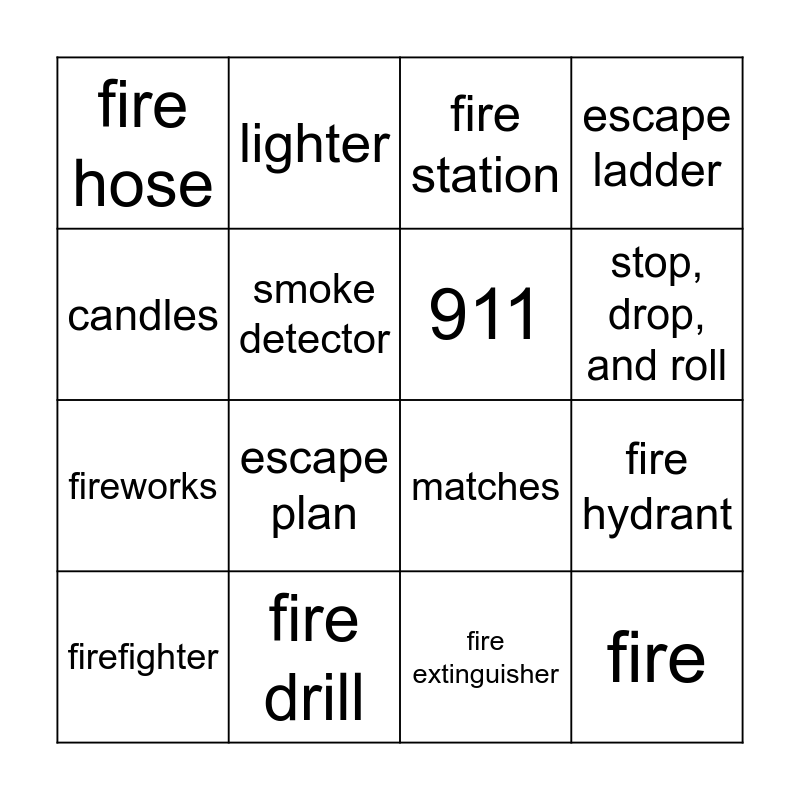 This bingo card has 17 words: fire extinguisher, firefighter, fire station, fire hose, escape plan, escape ladder, fire hydrant, 911, stop, drop, and roll, smoke detector, fire drill, matches, candles, lighter, fireworks, fire truck and fire.