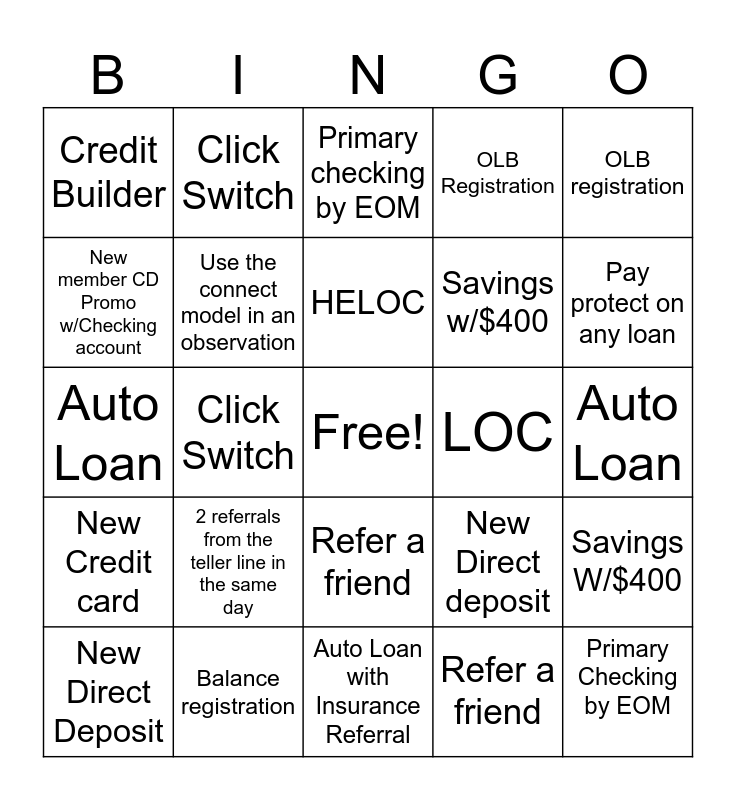 This bingo card has a free space and 24 words: New Direct Deposit, 2 referrals from the teller line in the same day, HELOC, Refer a friend, OLB registration, Credit Builder, Click Switch, Primary checking by EOM, LOC, Auto Loan, Auto Loan, Use the connect model in an observation, New Direct deposit, Savings W/$400, New member CD Promo w/Checking account, Balance registration, Auto Loan with Insurance Referral, OLB Registration, Pay protect on any loan, New Credit card, Click Switch, Refer a friend, Savings w/$400 and Primary Checking by EOM.