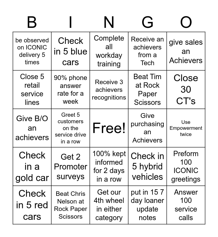 This bingo card has a free space and 24 words: Get 2 Promoter surveys, Beat Chris Nelson at Rock Paper Scissors, Receive 3 achievers recognitions, Check in 5 red cars, give sales an Achievers, be observed on ICONIC delivery 5 times, Close 5 retail service lines, Check in 5 blue cars, Give purchasing an Achievers, 100% kept informed for 2 days in a row, Beat Tim at Rock Paper Scissors, Give B/O an achievers, Check in 5 hybrid vehicles, Preform 100 ICONIC greetings, 90% phone answer rate for a week, put in 15 7 day loaner update notes, Use Empowerment twice, Complete all workday training, Close 30 CT's, Greet 5 customers on the service drive in a row, Answer 100 service calls, Check in a gold car, Receive an achievers from a Tech and Get our 4th wheel in either category.