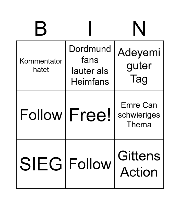 This bingo card has a free space and 8 words: Emre Can schwieriges Thema, Adeyemi guter Tag, Dordmund fans lauter als Heimfans, SIEG, Kommentator hatet, Gittens Action, Follow and Follow.