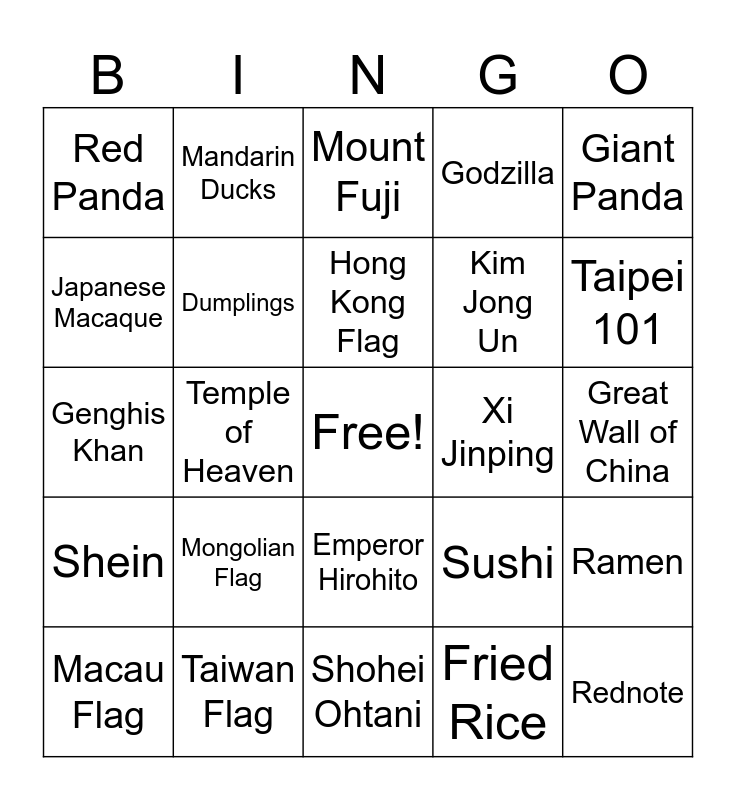 This bingo card has a free space and 24 words: Mongolian Flag, Taiwan Flag, Hong Kong Flag, Macau Flag, Giant Panda, Red Panda, Japanese Macaque, Mandarin Ducks, Xi Jinping, Emperor Hirohito, Kim Jong Un, Genghis Khan, Sushi, Ramen, Dumplings, Fried Rice, Great Wall of China, Mount Fuji, Taipei 101, Temple of Heaven, Rednote, Shein, Godzilla and Shohei Ohtani.